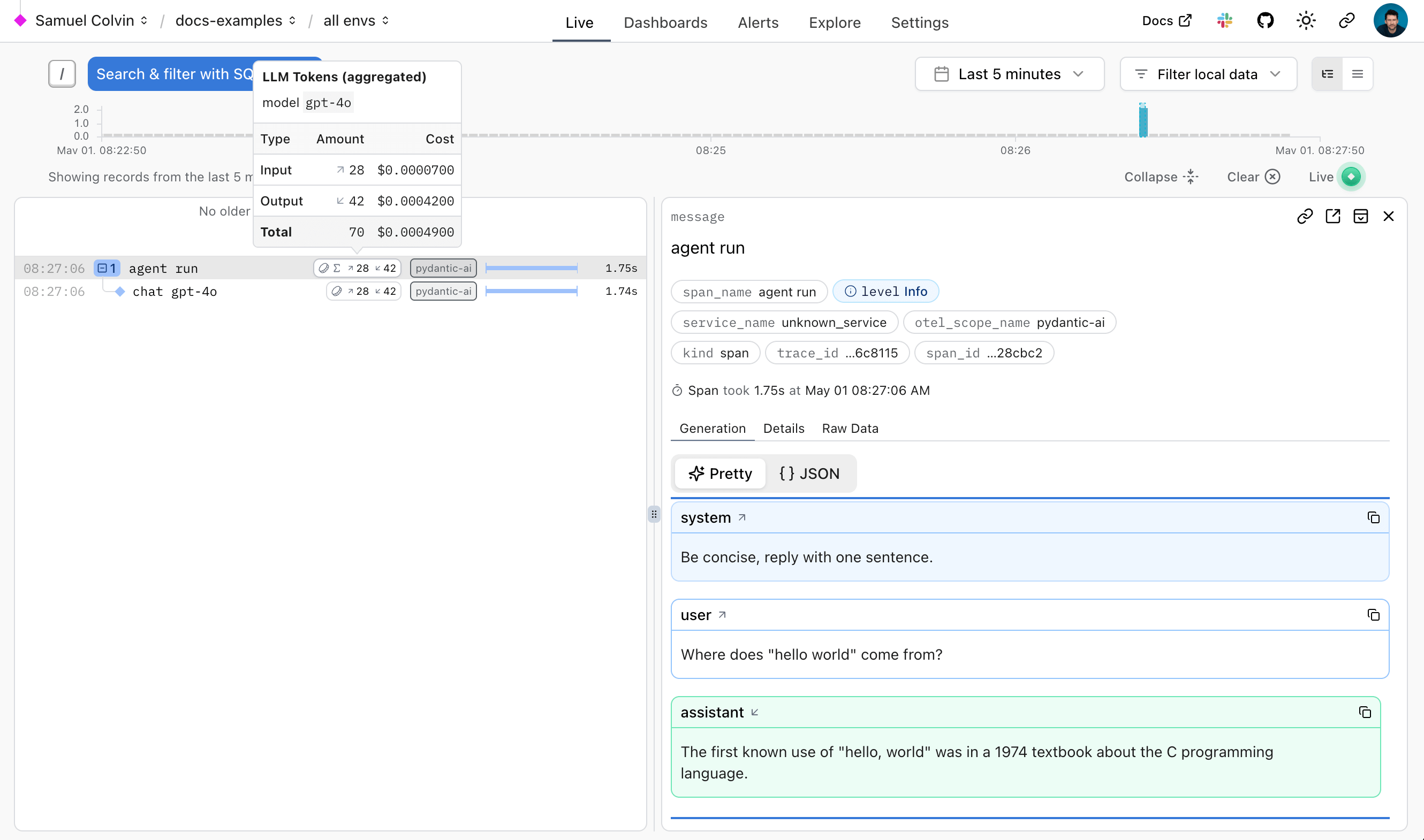 With that, you can start using Logfire to instrument Pydantic AI code: